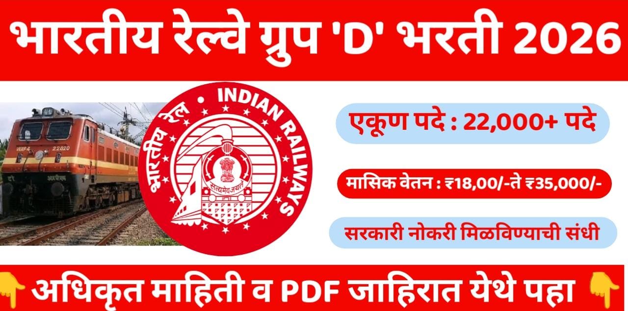 RRB Group ‘D’ Bharti 2026 : भारतीय रेल्वे ग्रुप ‘D’ भरती 2026 ! एकूण 22,000+ पदासाठी मोठी भरती जाहीर.